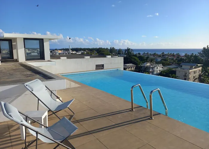 Appartement Ocean View Penthouse With Infinity Swiming Pool à Flic-en-Flacq spacieux est situé à moins de 19 minutes à pied de la plage de Flic en Flac et dispose d'une piscine sur le toit. L'un des points forts du domicile de 78 m² est la terrasse qui permet aux clients d'admirer la vue sur la mer.